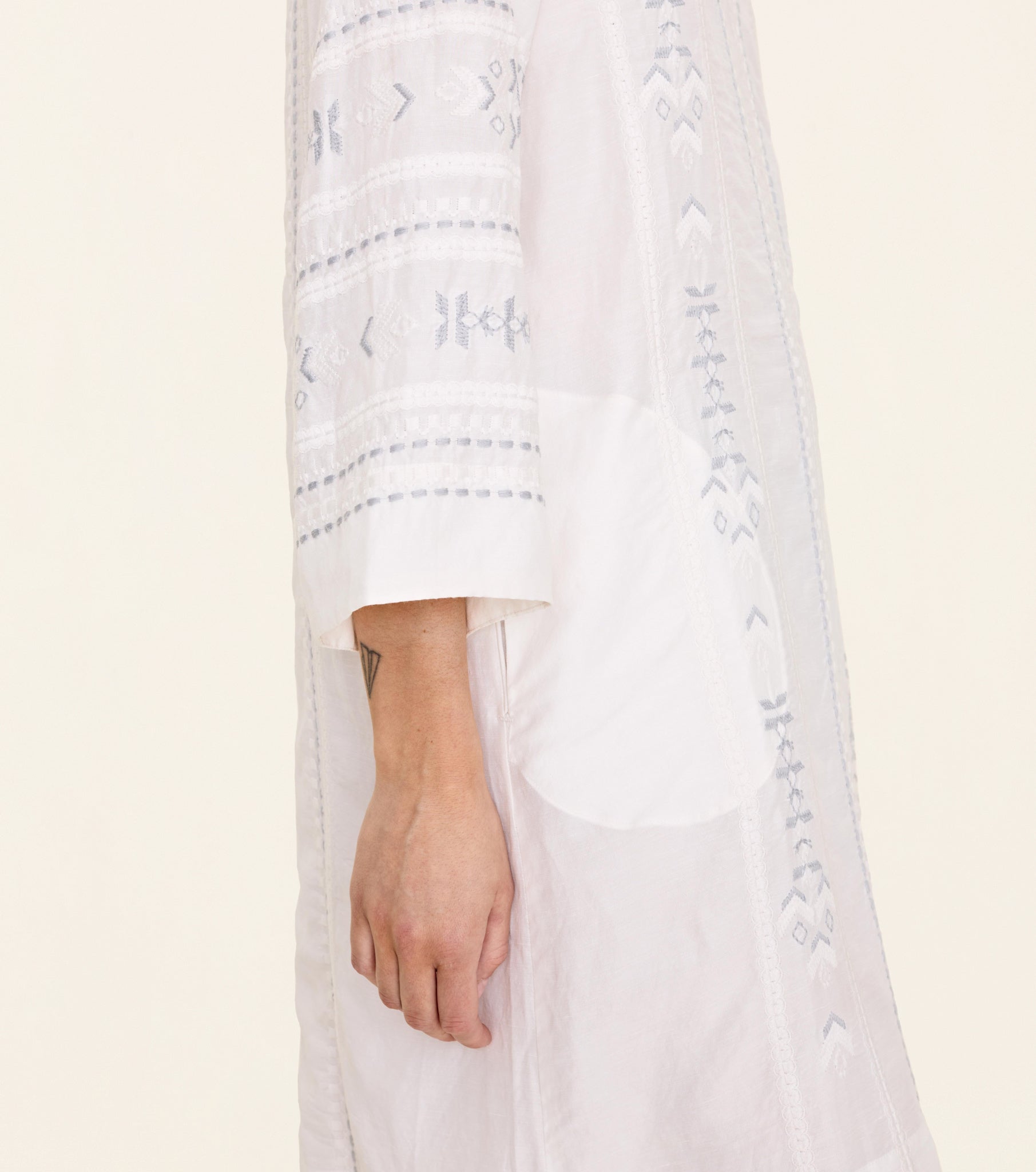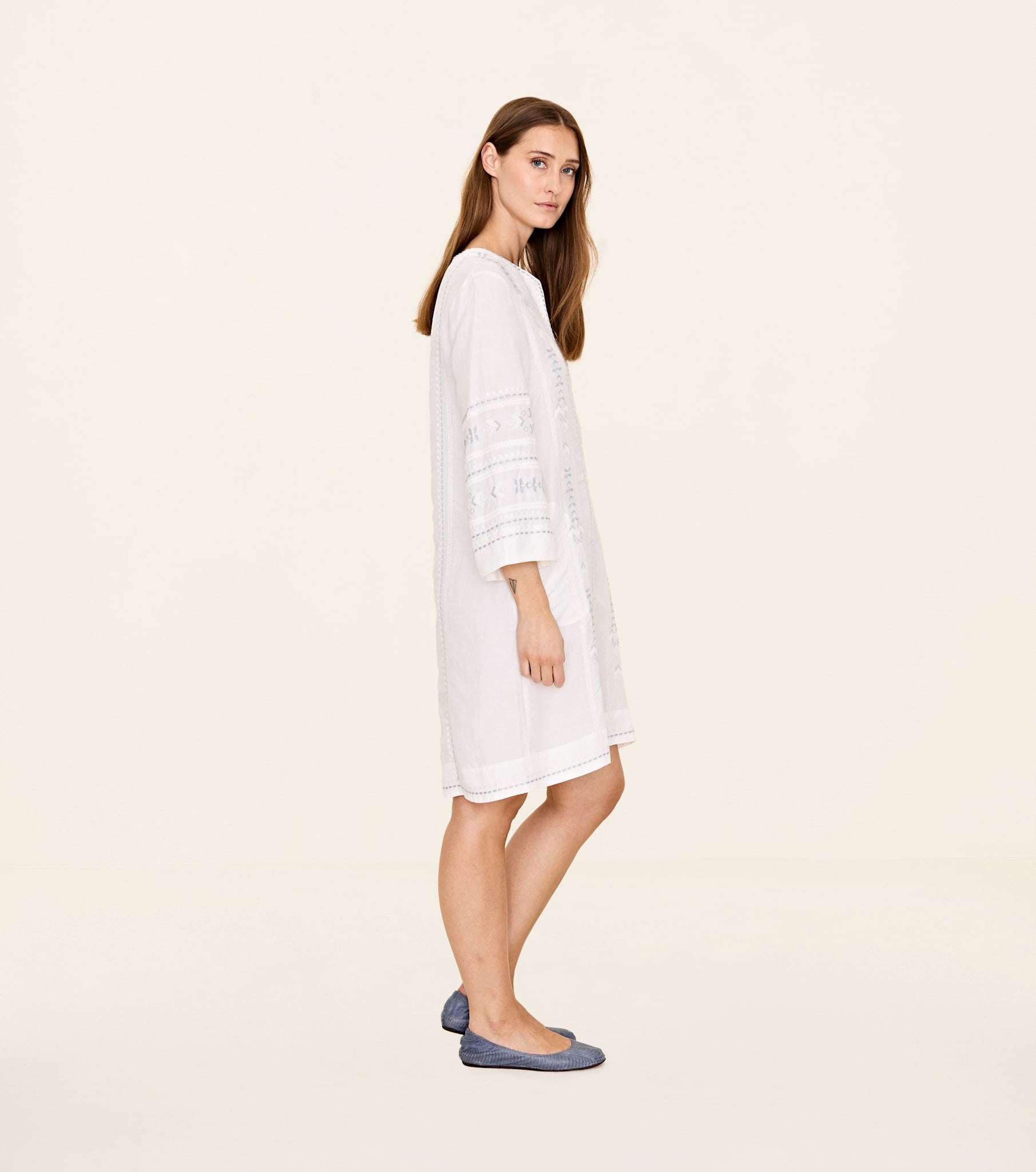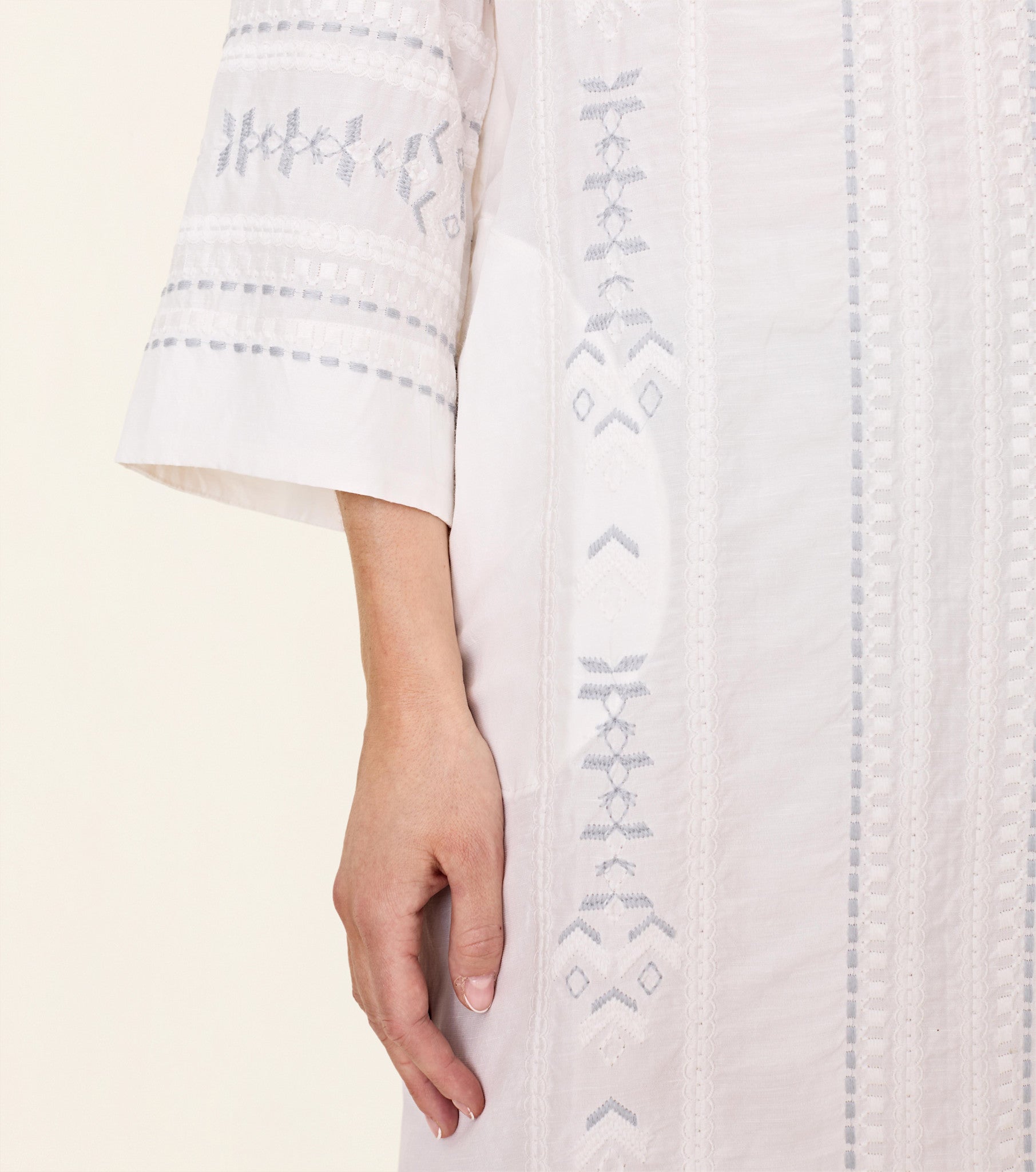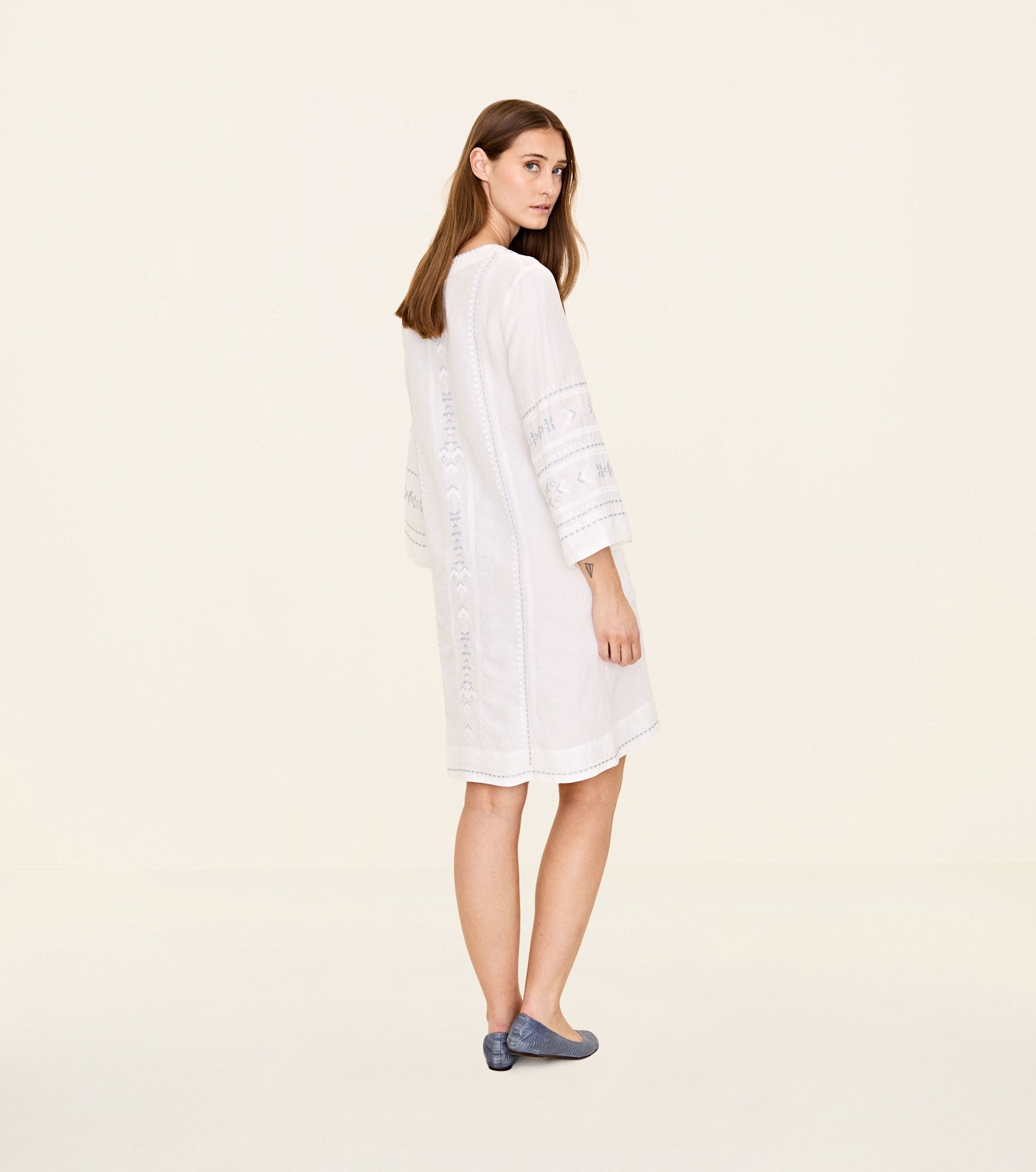 The Odd Molly Harvest Day Tunic is a knee-length tunic dress with a loose fit and long sleeves. It features a V-neck, A-line skirt, side pocket, and detailed embroidery. The fabric is woven for a flowy silhouette.|PRODUCT DETAILSPRODUCT DETAILS