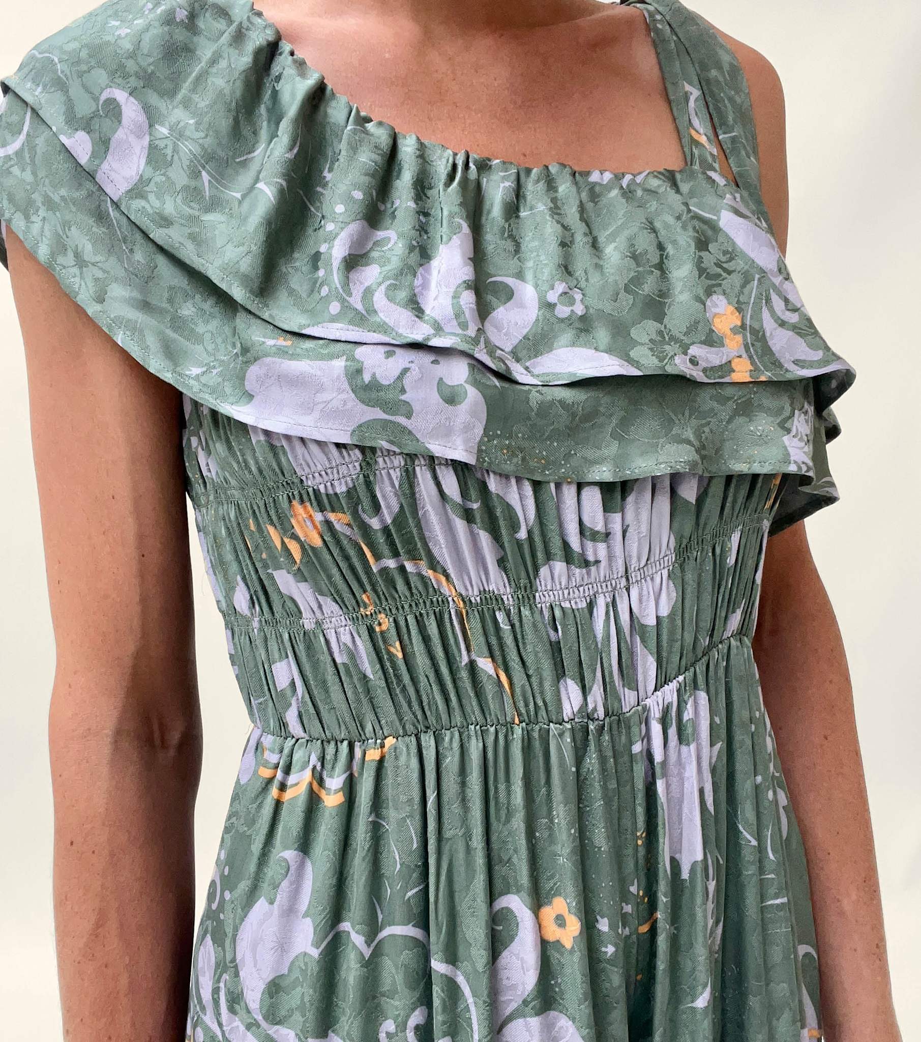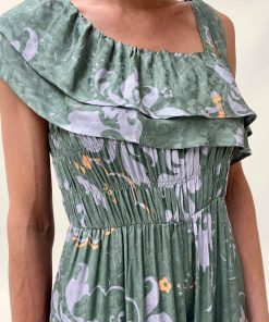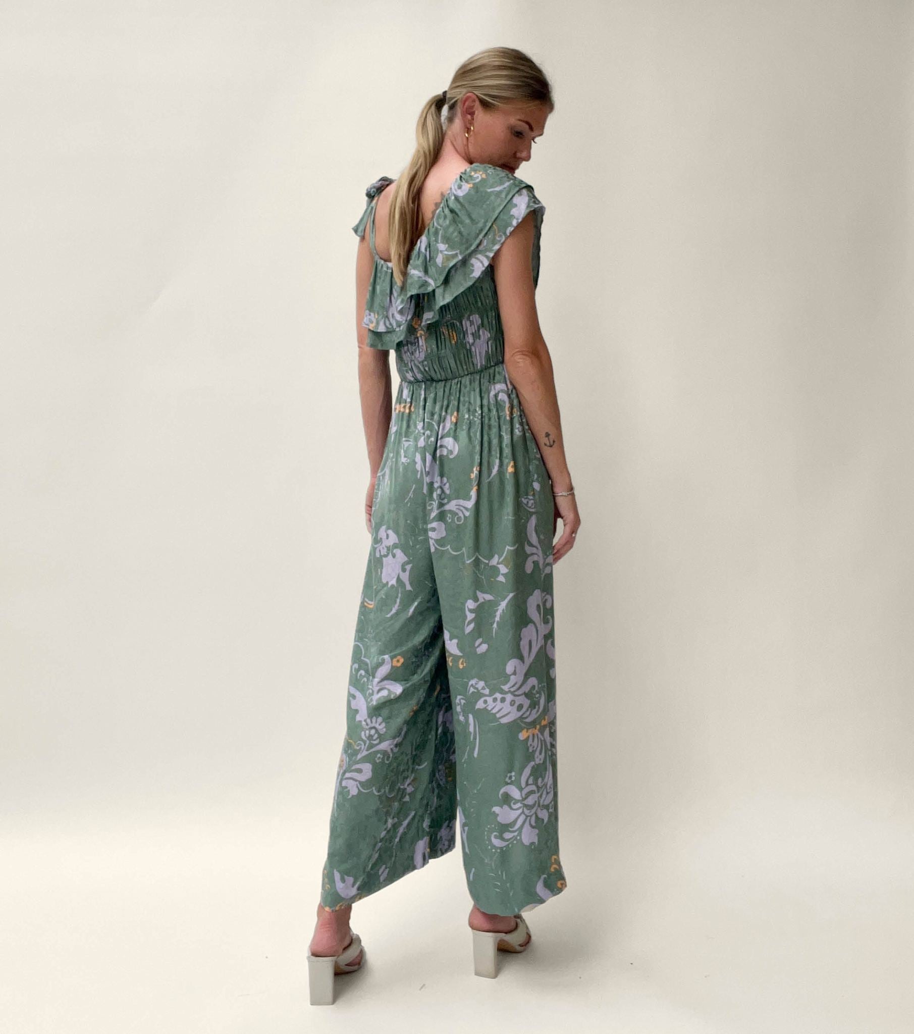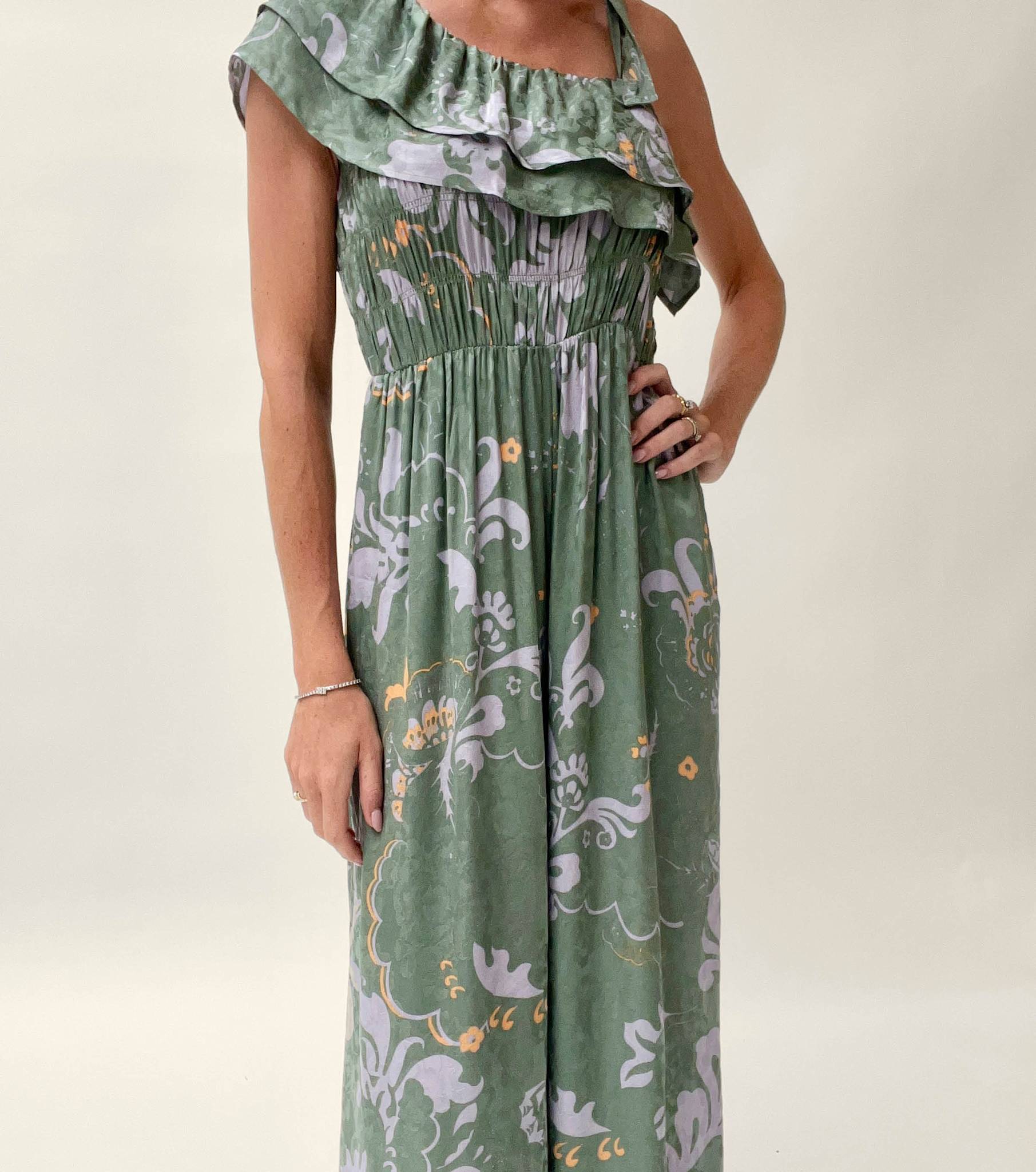The Odd Molly Samira Jumpsuit is a jacquard woven viscose jumpsuit with wide legs. It has a shoulder strap with ties on one shoulder and is off-shoulder with frills on the other one. The smocking at the bodice gives it a nice fit and the legs a flowy look.
