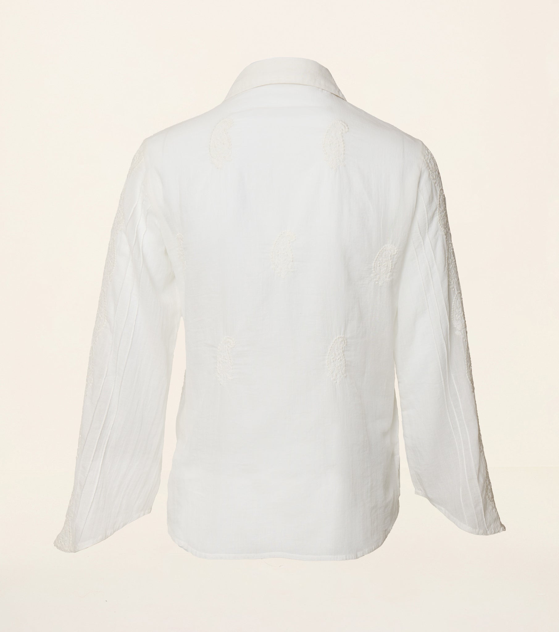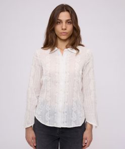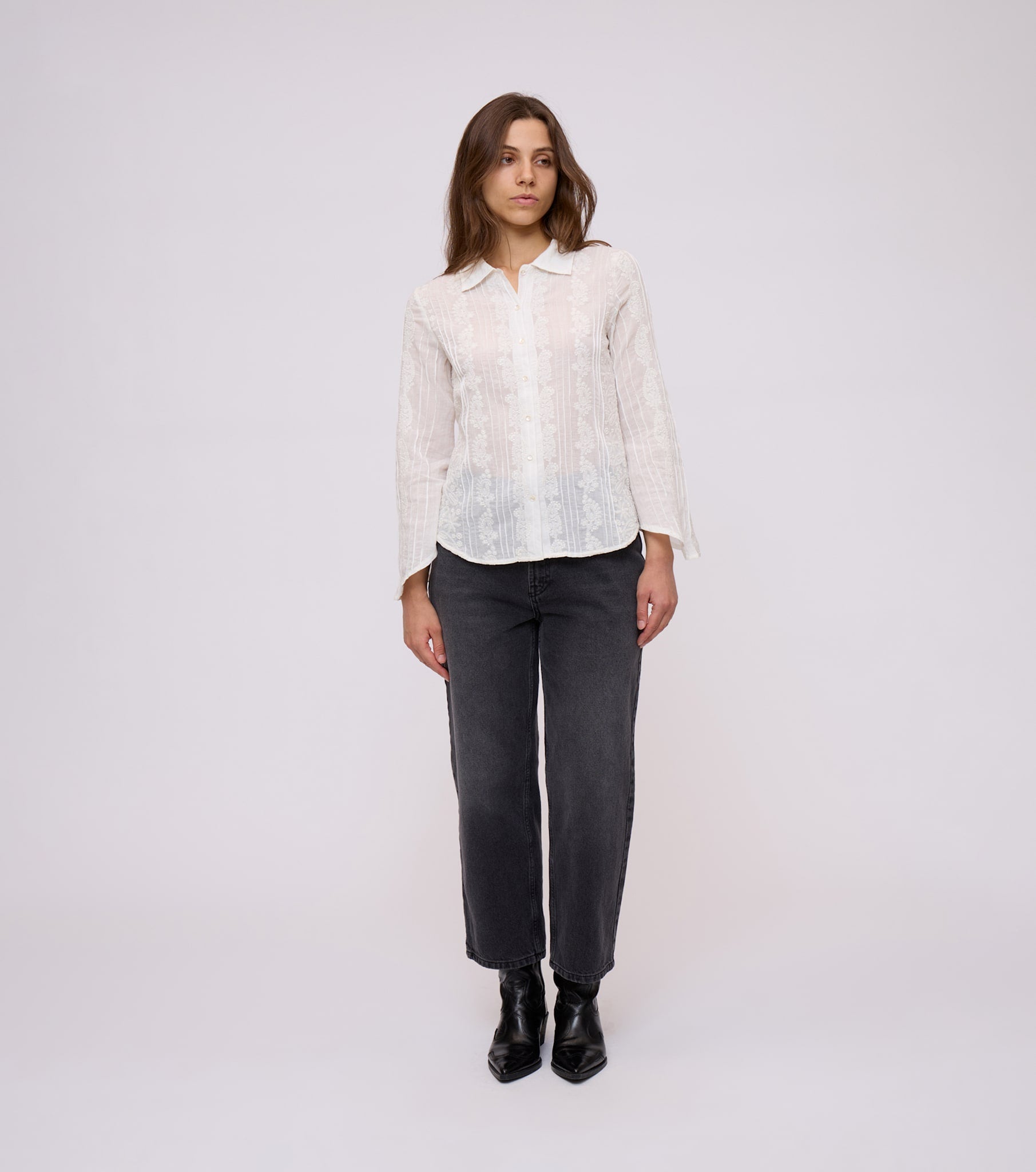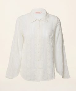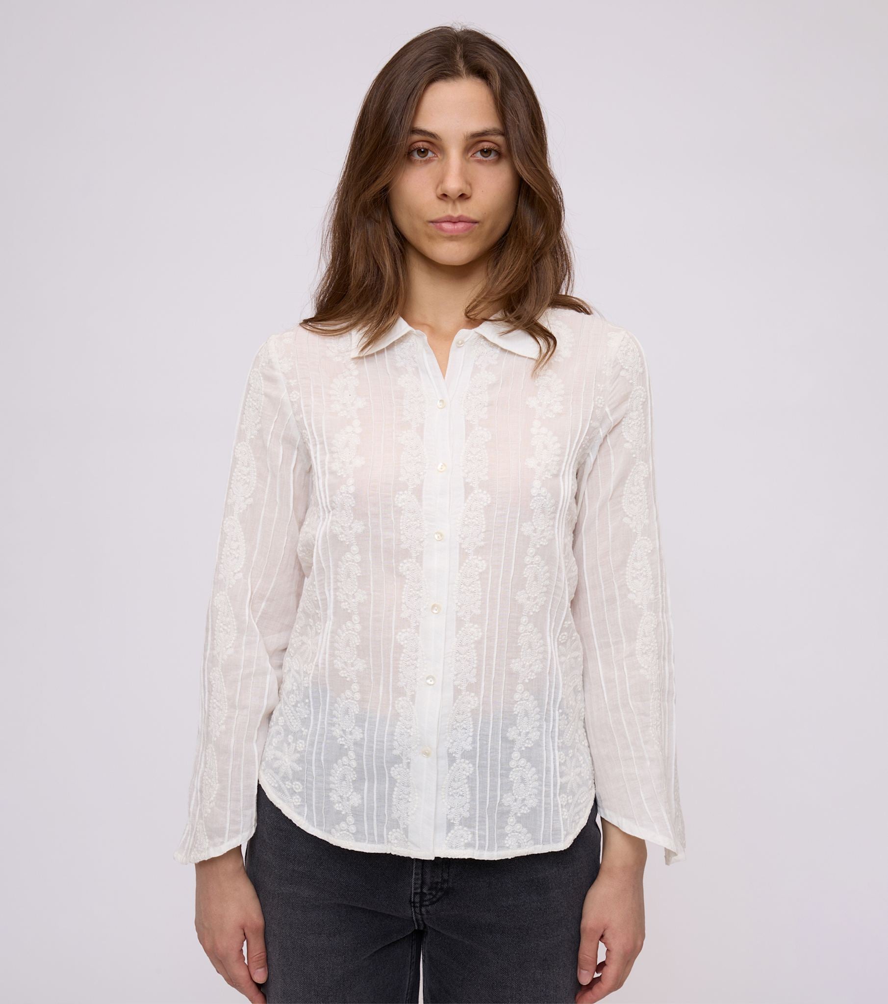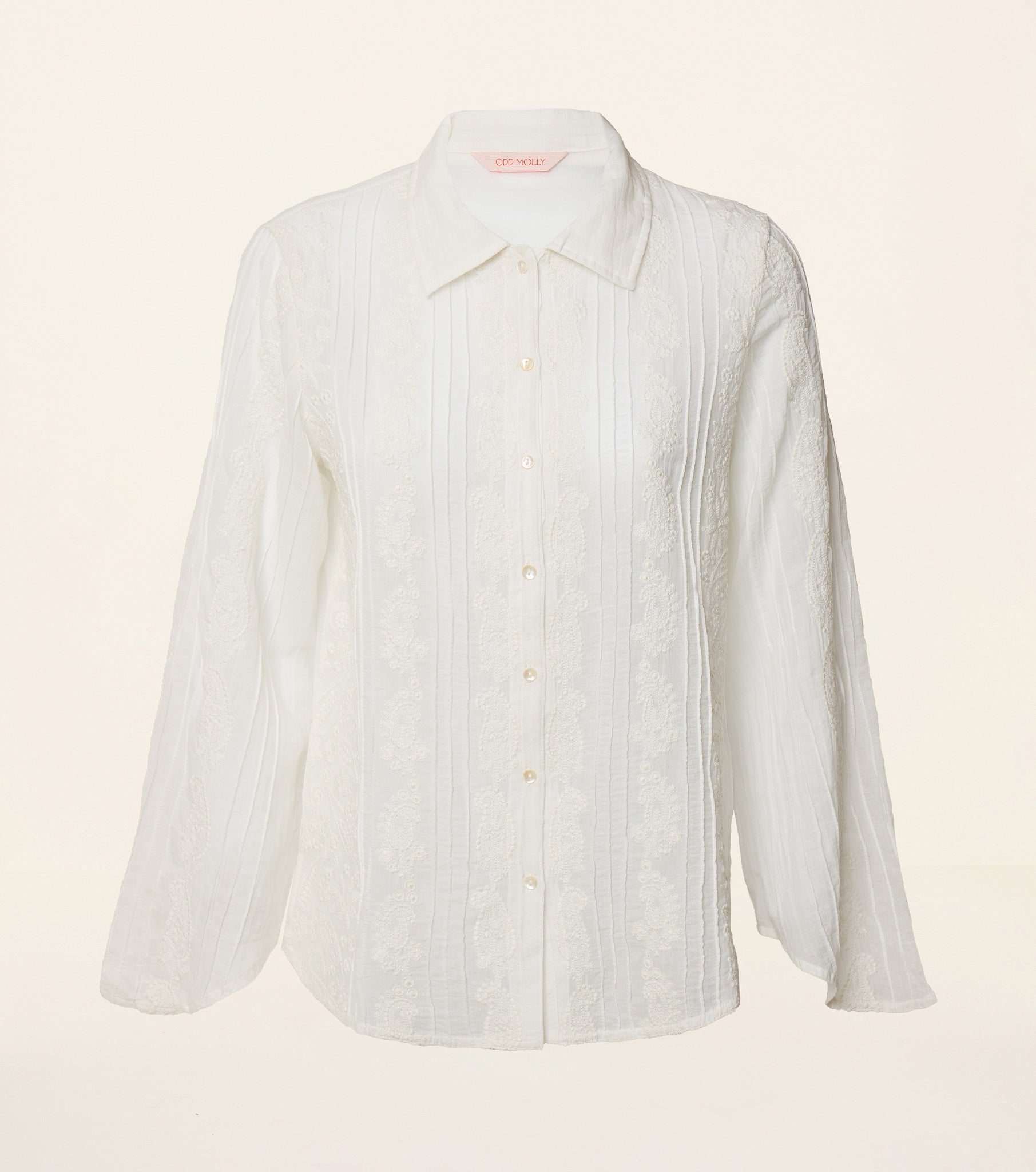 The Odd Molly Thursday Songs Shirt is a regular-fit shirt with long sleeves and a button front. It features embroidery, pleats, and Mother-of-Pearl buttons. The shirt is woven and has a soft collar at the neck.